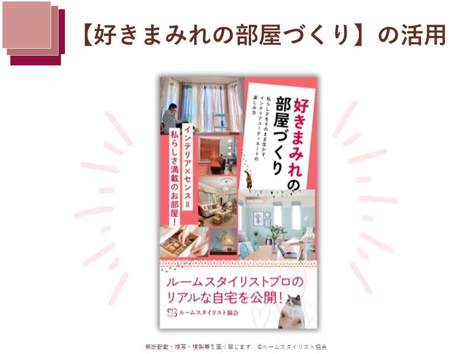クライアントの様々な部屋づくりの悩みに寄り添い、思い描くゴールに導くべきアドバイスやルームスタイリングが出来る「ルームスタイリストプロ」の育成と活動支援を行っていきたいと思います。